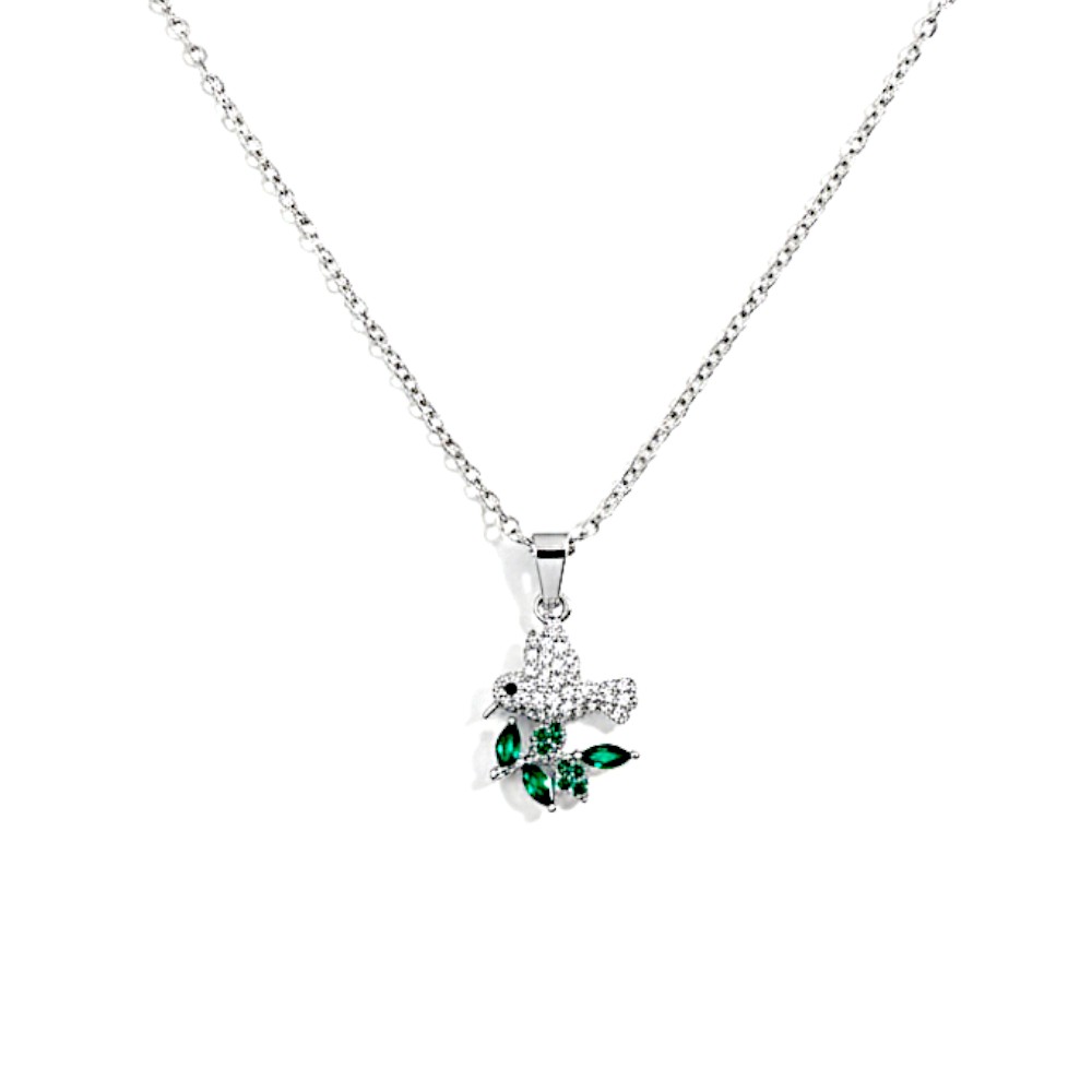 Collar colibri con piedritas blancas y hojitas verdes de piedra Medida 45cm mas alargue de 5cm Acero quirurgico