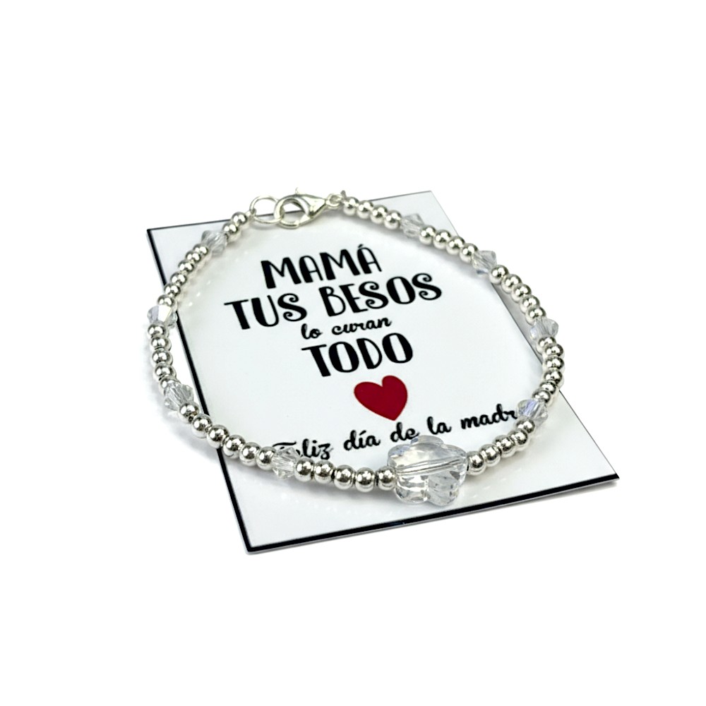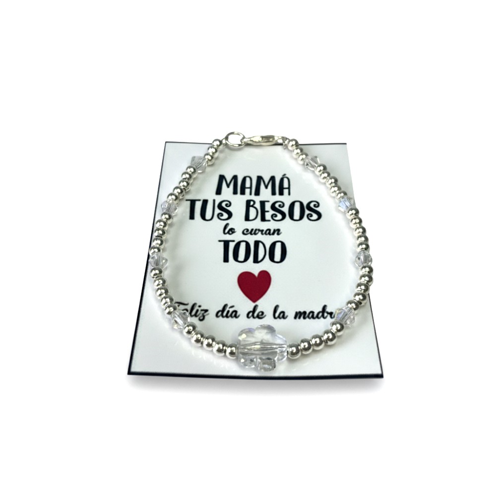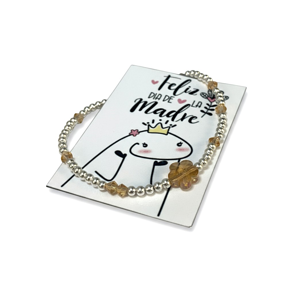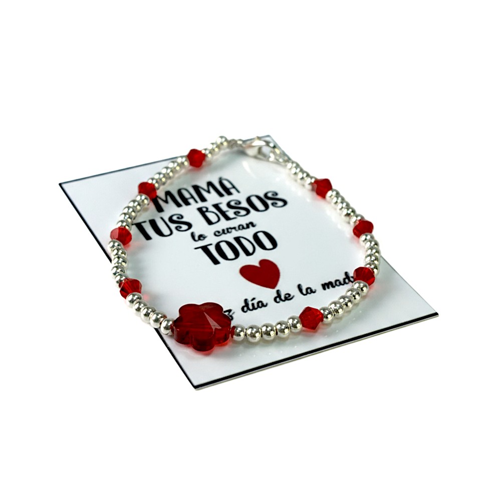 Pulsera combinada con bolitas de acero blanco y cristal con dije central flor . Varios colores disponibles